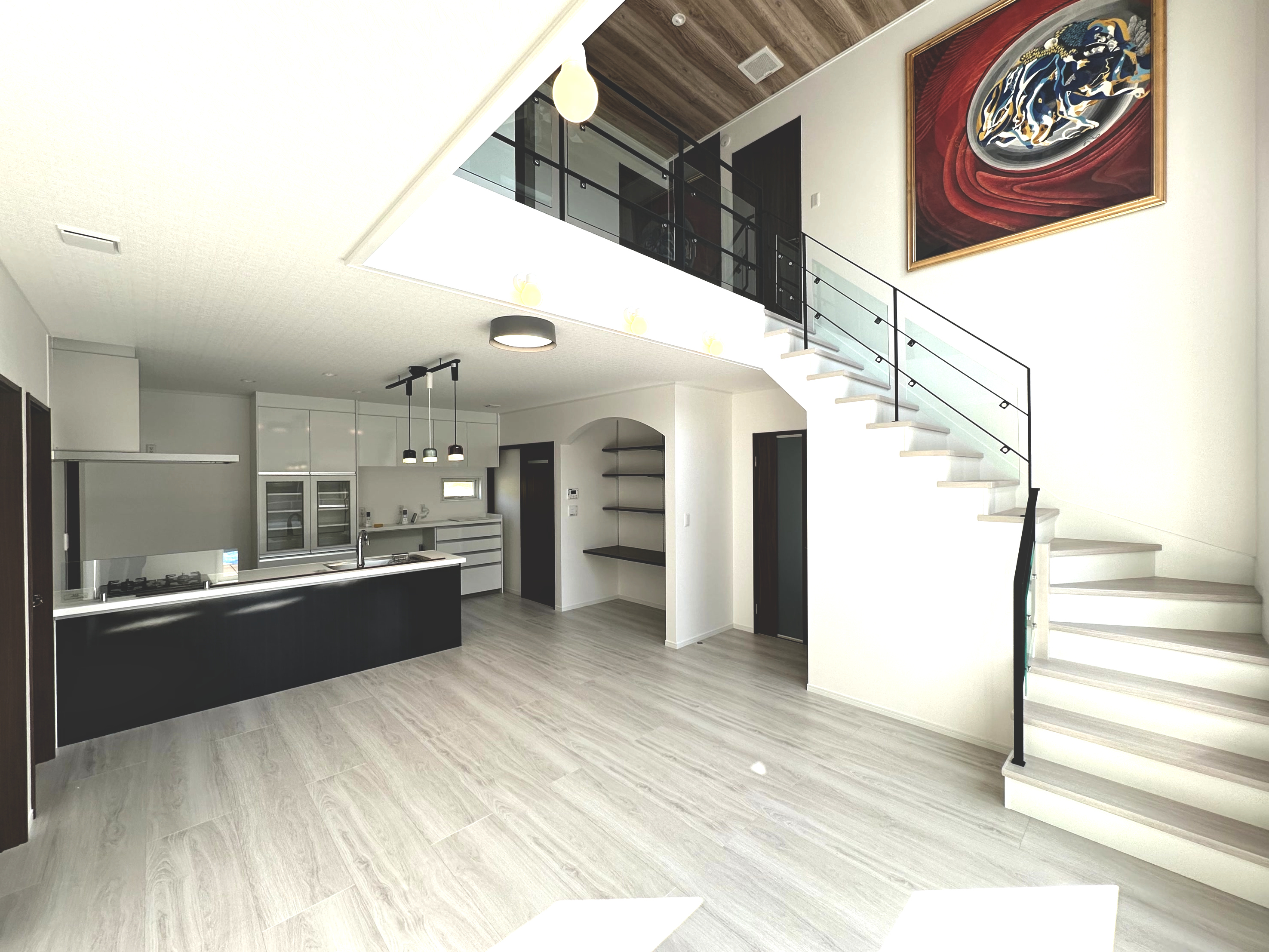 南からの陽光とロートアイアンが映える吹き抜けの家